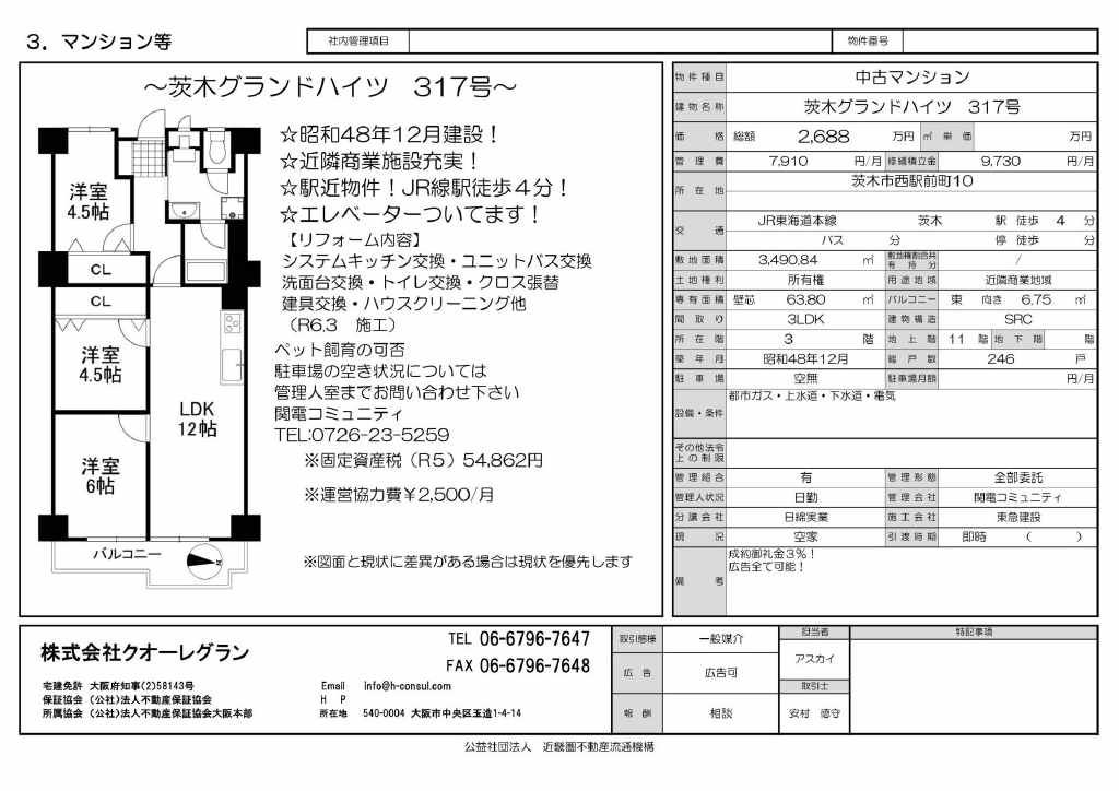 ☆地上11階建て6階のお部屋です ☆2024年7月に室内大規模リフォーム歴あり ☆JR茨木駅より徒歩4分の生活至便な立地のマンションです